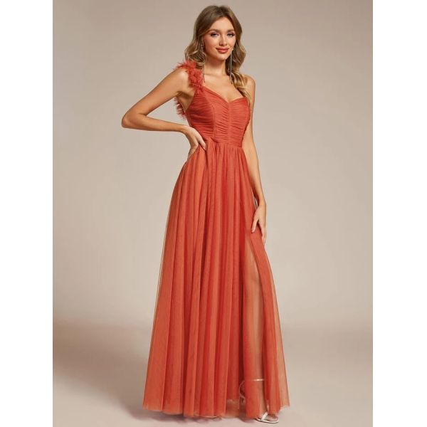 Exquisite One-shoulder Sweetheart Ruffled A-line Zipper Pleated High Slit Burnt Orange Tulle Evening Dress Images |