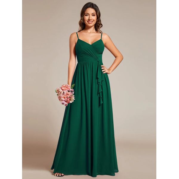 Elegant Maxi V-neck Lotus Leaf Pleating Spaghetti Strap A-line Dark Green Chiffon Evening Dress Images |